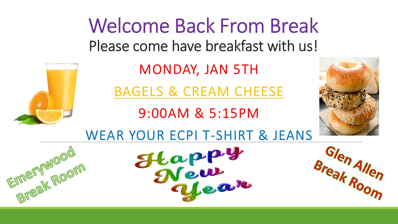 To celebrate the New Year, we are hosting a “welcome back” breakfast event—featuring bagels & cream cheese—on MONDAY, JANUARY 5, in the student breakrooms at both Richmond Campuses.